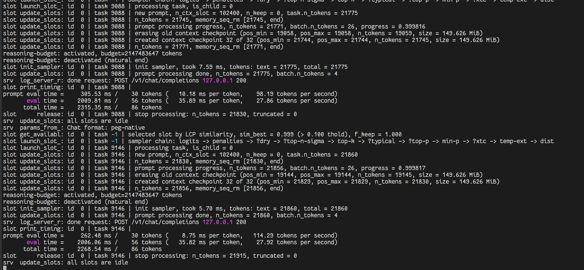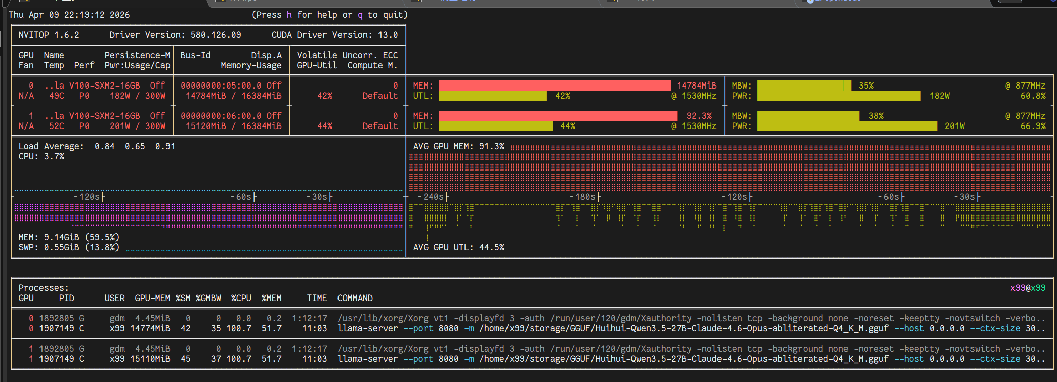 llama-server --port 8080 -m ~/storage/GGUF/Huihui-Qwen3.5-27B-Claude-4.6-Opus-abliterated-Q4_K_M.gguf --host 0.0.0.0 --ctx-size 153600 --n-gpu-layers 99 --tensor-split 1,1 --flash-attn on --cache-type-k q4_0 --cache-type-v q4_0 --parallel 3 --threads 12 --batch-size 512 --ubatch-size 512 --temp 0.3 --min-p 0.05 --repeat-penalty 1.1 --timeout 1200 --api-key xxxxxxxxx- frpc重新运行穿透,openai重新运行