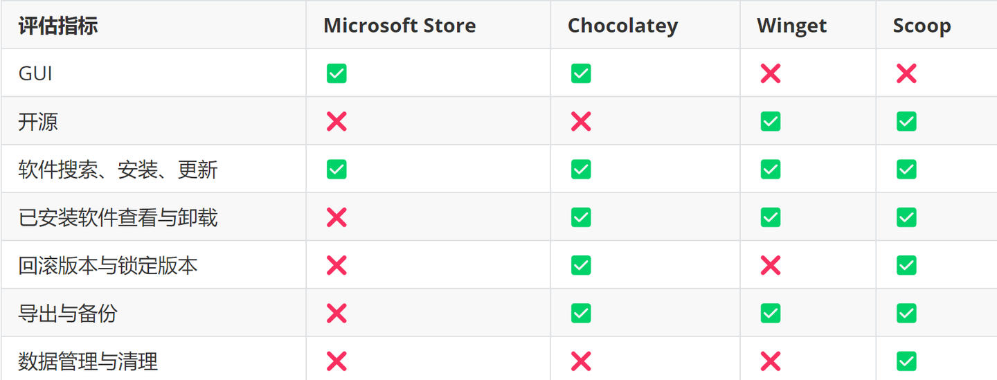 - 数据管理与清理——主要就是软件管理逻辑方面的需求了(强迫症需求),除了Scoop其他工具的数据管理一言难尽吧,虽然Scoop许多第三方仓库中的软件也没实现好。