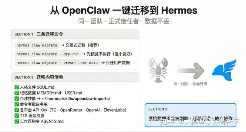 首次运行 hermes setup 时,如果检测到你本地有 ~/.openclaw 目录,会自动提示迁移。