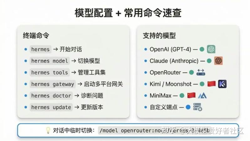 第一,”模型无关”是最大的保险。 Hermes 不绑定任何一家模型,意味着你今天用 GPT-4,明天 Claude 更强了切 Claude,后天国产模型够用了切国产省钱——你的 agent 积累的技能和记忆不受模型切换影响。这在 AI 变化这么快的今天,是最重要的一条护城河。