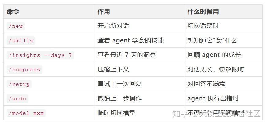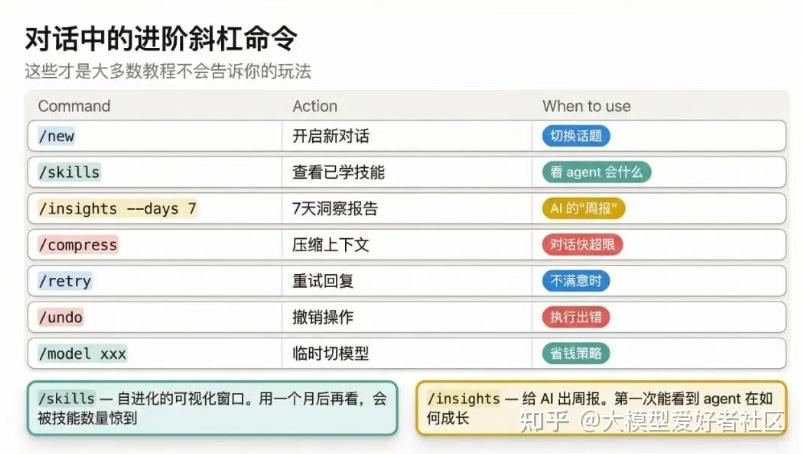 /insights --days 7 —— 相当于给你的 AI 助手出一份”周报”。它会总结这周它学到了什么、哪些技能被频繁调用、哪些任务模式在重复。这不是花哨功能,这是让你真正理解 agent 在如何进化的窗口。