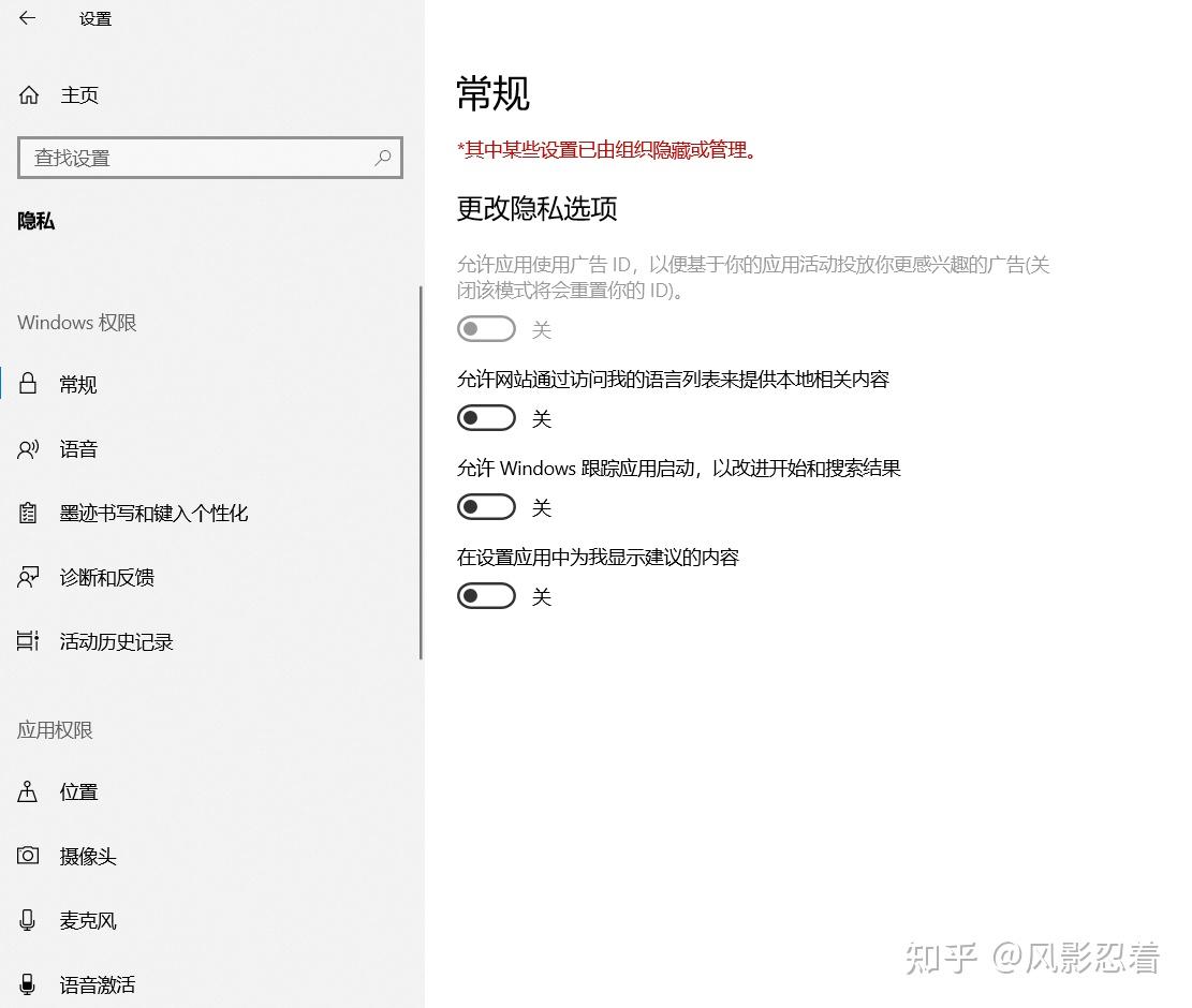 在打开的「隐私」窗口里面,根据需要逐一关闭权限:
